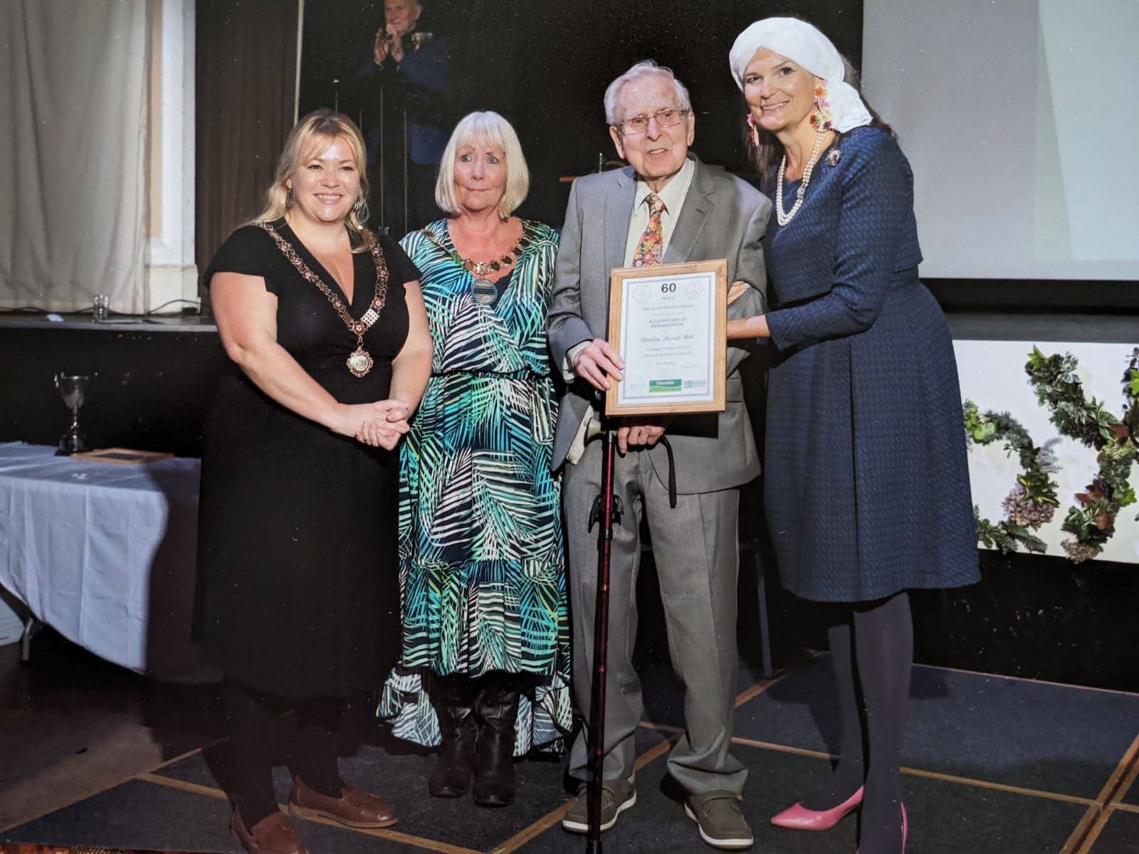 Stan receiving a lifetime achievement award from Lady Fellows, with the Mayor of Bath Cllr Michelle ODocherty and Chair of the council Karen Walker, July 2025'