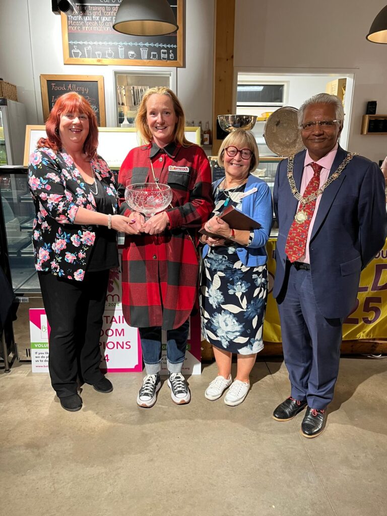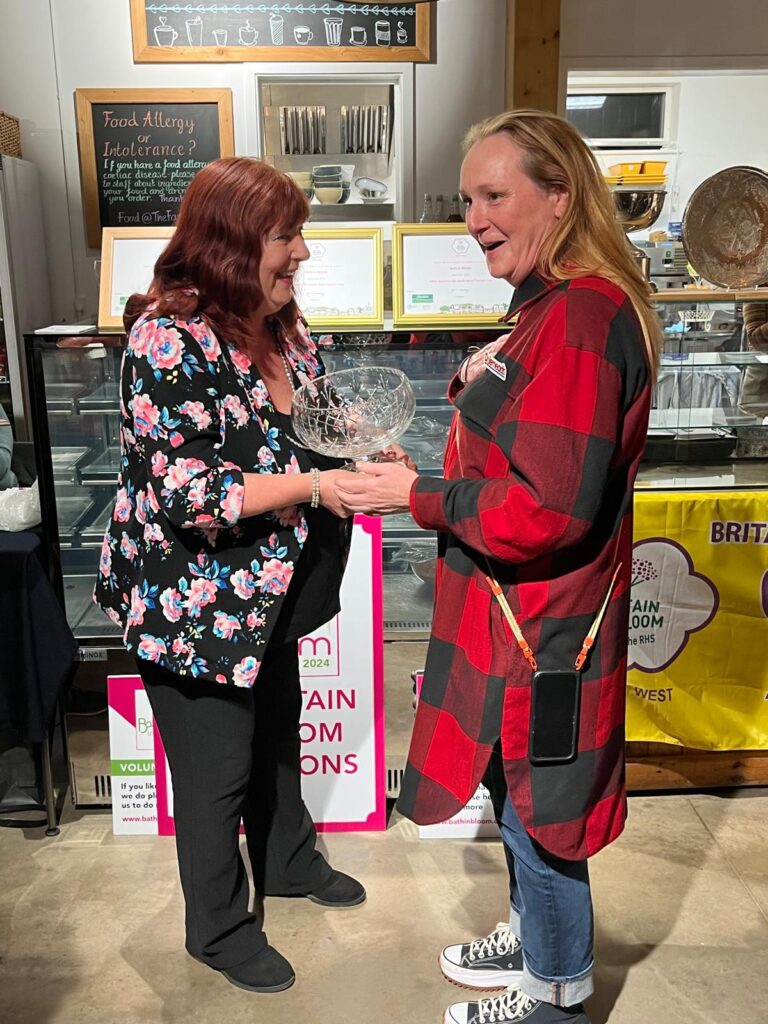 Rachel Meyrick from Dolemeads Community Garden receiving a glass rose bowl trophy presented by Loraine Morgan-Davies and The Mayor of Bath Cllr Dr Bharat Pankhania at the Bath in Bloom It’s Your Neighbourhood Awards evening. The It’s Your Neighbourhood (IYN) scheme is run by the RHS and allows community projects to be assessed by an RHS judge. There are 5 levels of awards and Dolemeads achieved the highest award of  “Level 5 – Outstanding”.